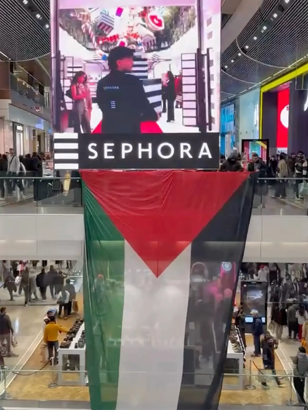 Around 100 activists gathered at the shopping centre on Friday evening (26 December) and draped a large Palestinian flag over a railing, while protesters on another floor unfurled banners, waved smaller flags and threw leaflets onto the floor.